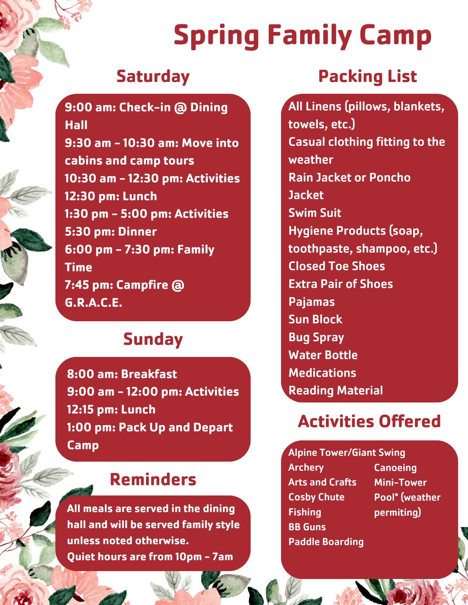 Join us for Spring Family Camp Weekend. Through this All-inclusive experience, you’ll get to enjoy 4 delicious camp meals, the cabin experience, camp activities, group and family activities AND an entertaining Campfire show!